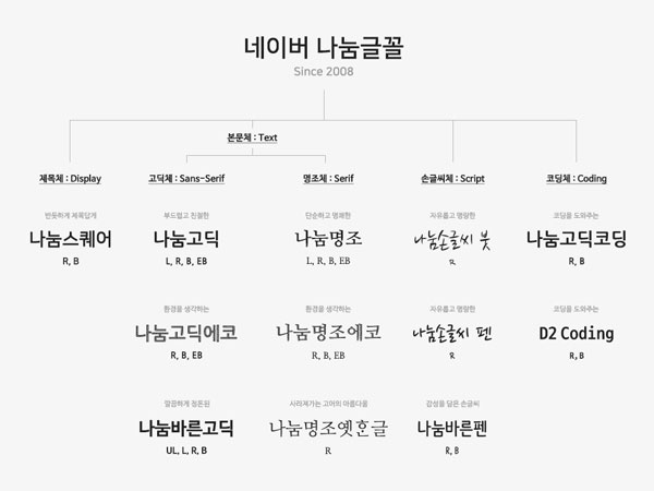 네이버가 본문용 서체인 나눔고딕과 나눔명조를 시작으로 제목용 서체인 나눔스퀘어까지 무료 배포함으로써, 이용자는 제목체, 본문체, 손글씨체 등 용도에 따라 다양한 형태의 글꼴을 활용할 수 있게 됐다.